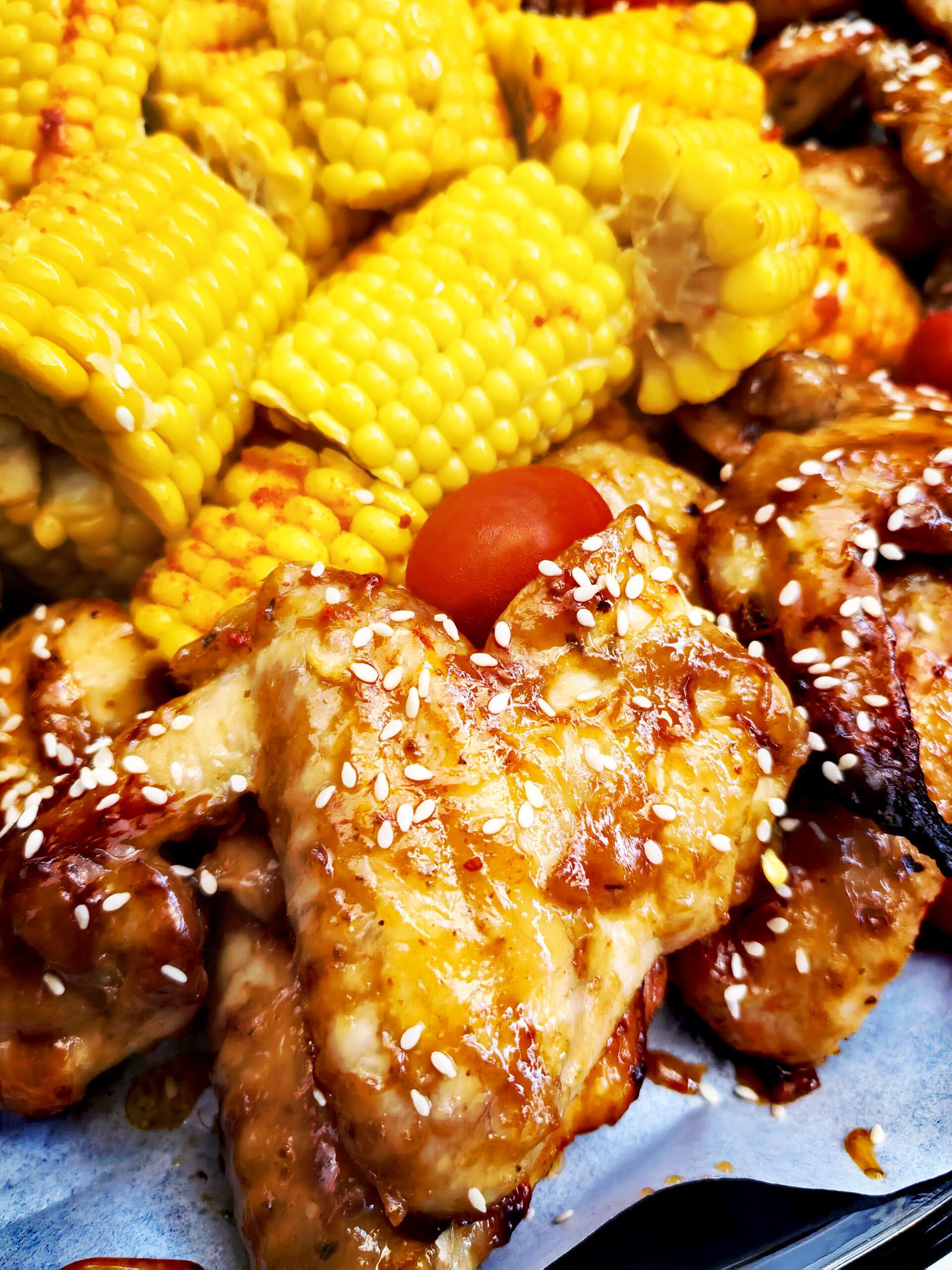 Choose from either Roasted Chicken Drumsticks or Roasted Chicken Wings (full) served on a platter with a choice of sweet corn riblets or roasted potato wedges.